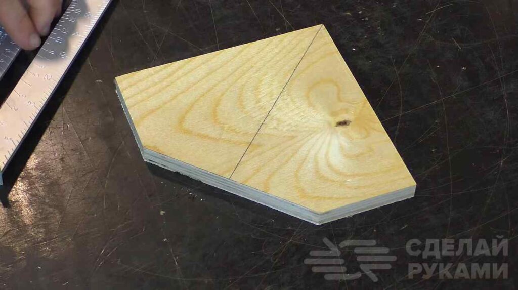 Первым делом из куска фанеры вырезаем треугольную заготовку. Размечаем линии отреза, соблюдая строго 90 градусов между отрезаемыми частями. Срезав все лишние части, размечаем центр заготовки и отмечаем радиус.
