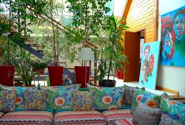 На втором этаже устроили кабинет-библиотеку, спальни для всех членов семьи, комнаты для гостей. Очень эффектно смотрятся огромные картины, развешенные практически по всему дому, а также везде расставлены многолетние комнатные растения и цветы, создающие благоприятную атмосферу для жизни и творчества.