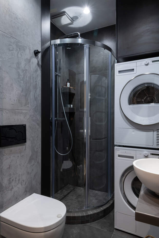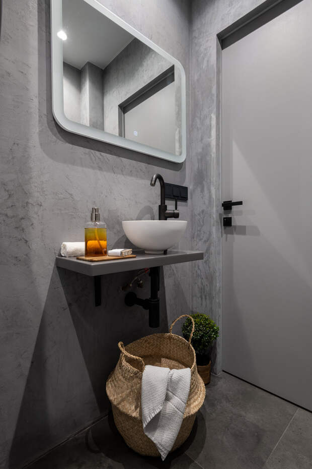 В ванной стены оформили микроцементом серого оттенка. Нужно покупать специальный для влажных зон — тогда проблем в эксплуатации не будет. Плитку на полу и мозаику в душе подобрали также у Italon.