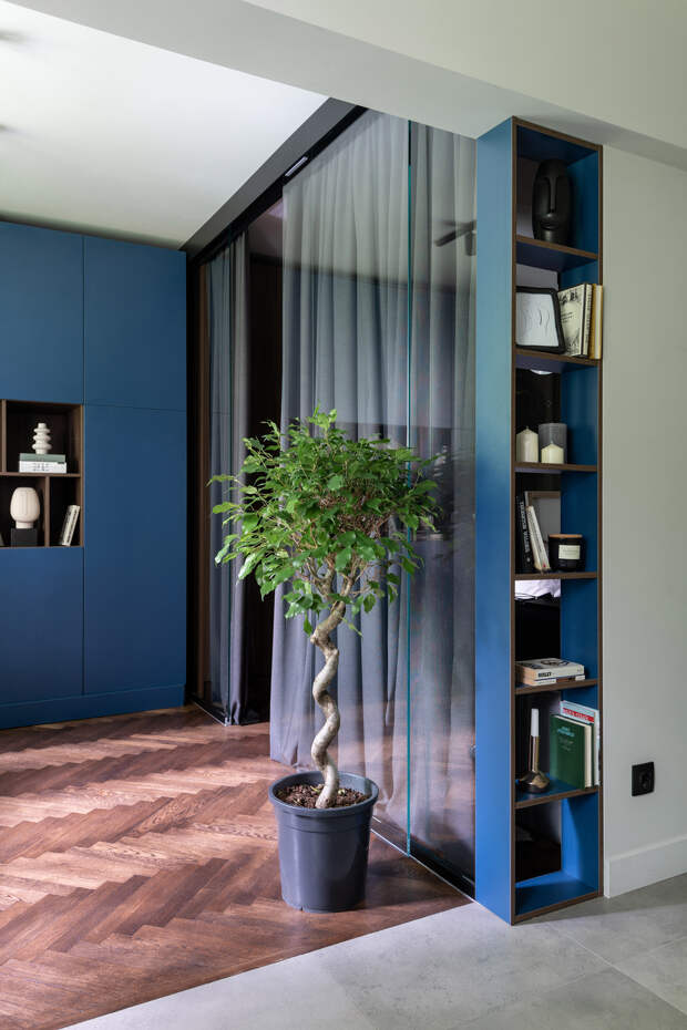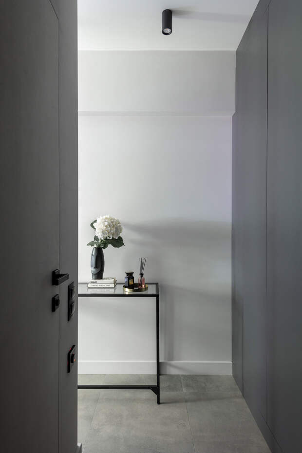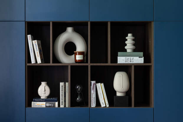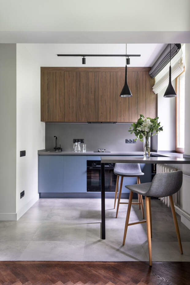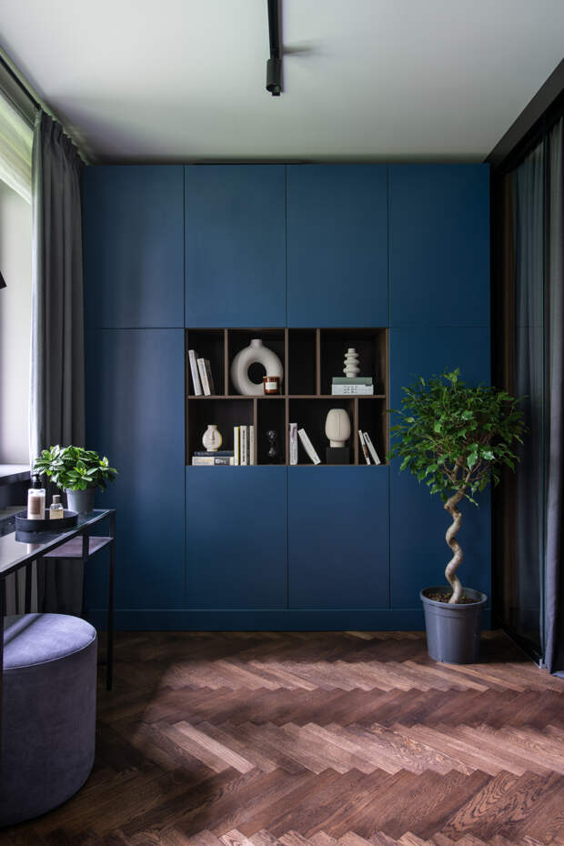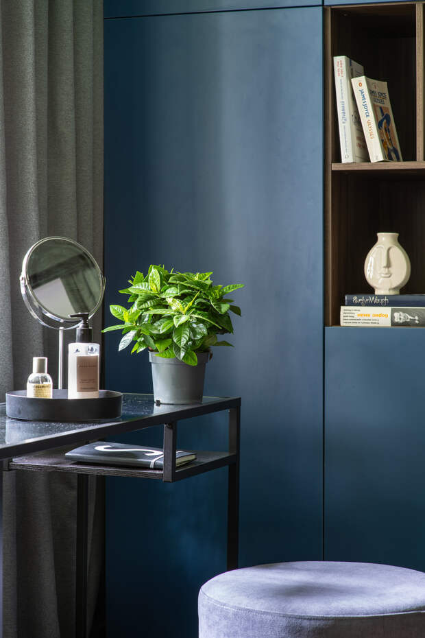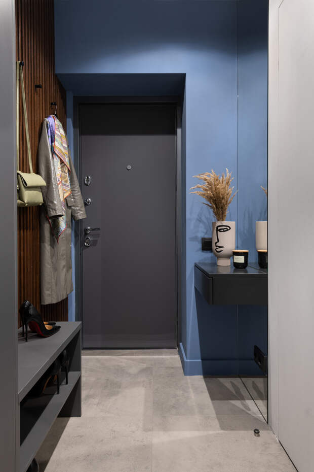 Эта небольшая квартира находится в хрущевке в центре Москвы. Хозяйка — молодая девушка, работает недалеко от дома, она хотела получить лаконичный интерьер без лишнего декора на стенах, в синих и серых тонах.