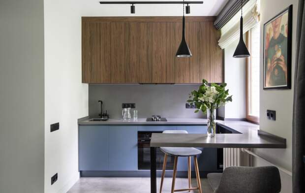 В этой квартире компактная кухня, спальня за перегородкой и встроенные системы хранения.