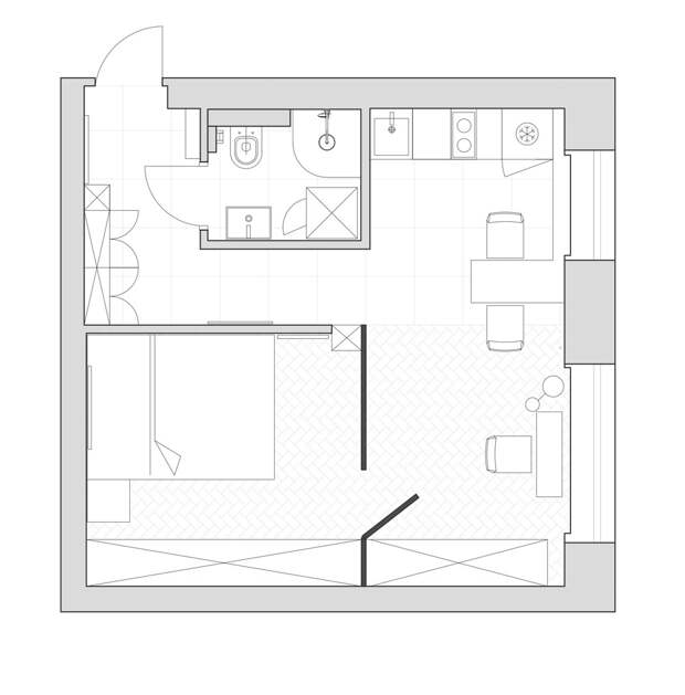 Дизайнеры из Huge Studio начали работу с создания удобной планировки. В квартире уже был ремонт, она представляла собой студию, поэтому пришлось заново сделать перегородку, чтобы изолировать спальное место от кухни-гостиной.