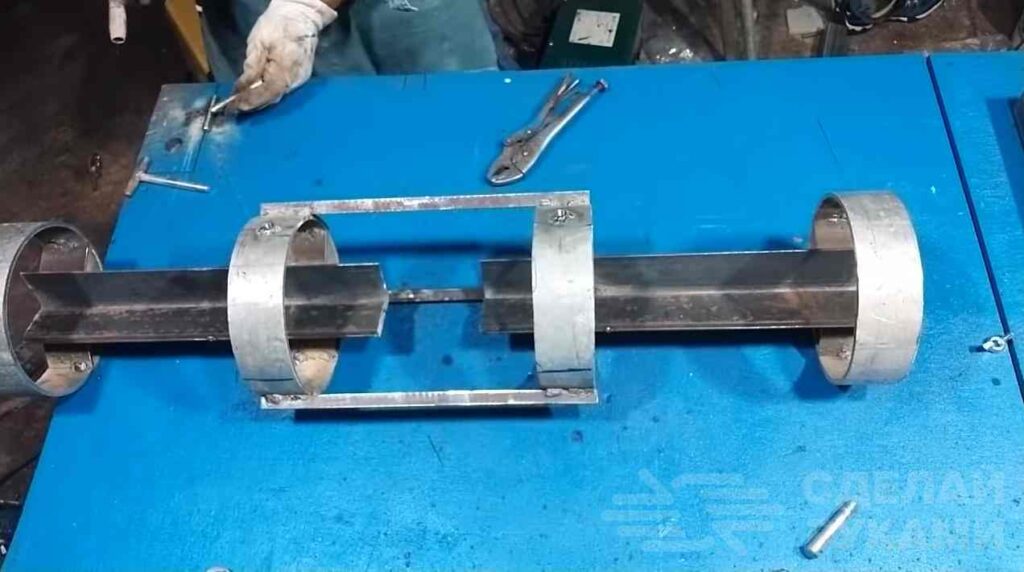 На следующем этапе автор приваривает к двум центральным кольцам куски квадрата (для усиления конструкции).