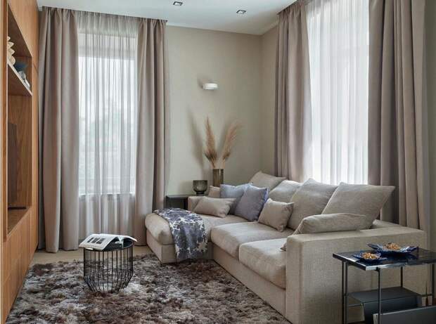 Поэтому при подготовке проекта дизайнеру требовалось учесть разные функции и количество помещений: гостиную, спальню, кабинет, кухню и два санузла.