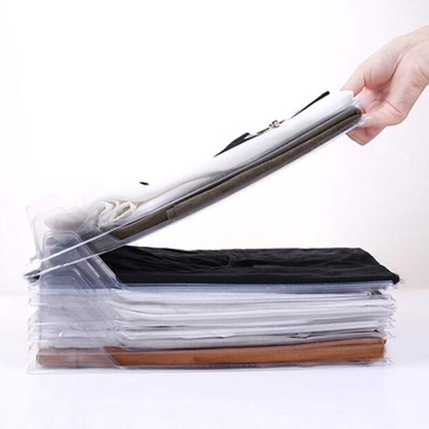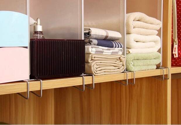 Если у вас настолько широкие полки в шкафу, что туда без проблем помещаются несколько стопок вещей, приобретите специальные перегородки для полок, которые сделают гардероб намного аккуратнее. Это прозрачные, но надежные устройства просто крепятся на основную полку. Благодаря им у вас получается не один большой, а несколько маленьких отсеков для одежды, что очень удобно и практично.