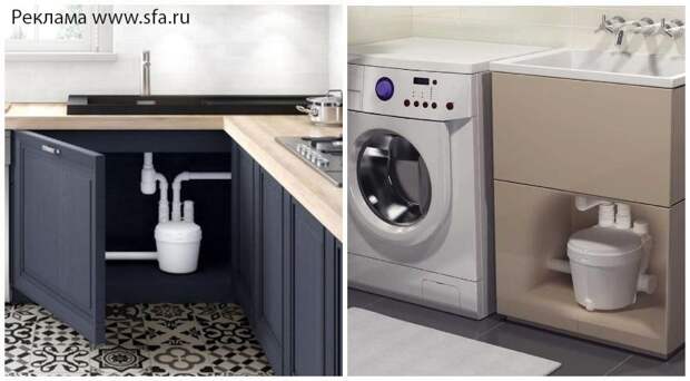 Если наклон сливной трубы небольшой, установите специальный канализационный насос, чтобы вода не застаивалась в мойке. Благодаря современным насосам компании SFA, независимо от главной канализационной трубы легко отвести стоки от раковин и бытовой техники. Главное, чтобы все подводящие к насосу трубы располагались с достаточным уклоном (3 см на 1 м) и не имели слишком большую протяженность.